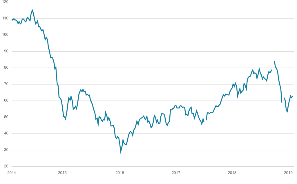The price of Brent Crude Oil in $USD per barrel. A sharp fall from over $100 a barrel in 2014 to less than $30 a barrel in 2016. The recovery since then has been modest.