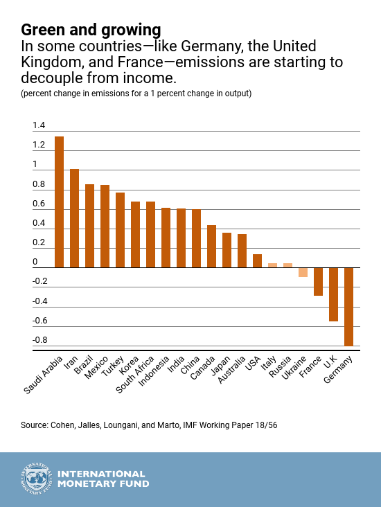 A paper last year by IMF economists (see source) found some promising results for the advanced economies of Germany, UK, and France. Their analysis found statistically significant evidence of absolute de-coupling between output growth and emissions growth. However, for many of the other economies only relative de-coupling had been achieved. Nevertheless, it’s encouraging that the UK, France, and Germany have implemented policies to transition away from fossil fuels and these seem to have worked – proving that taking coordinated action can achieve results.