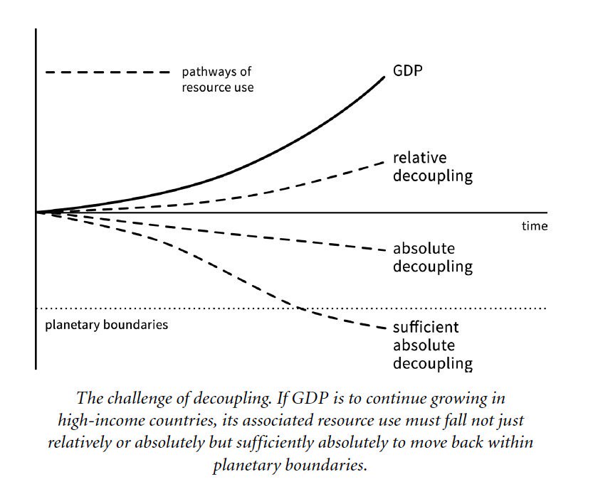 The above diagram shows the process of de-coupling occurring. For most of the previous 100-150 years growth has been closely followed by emissions. A reversal of this is required in the 21st century if we hope to curtail the degradation of the environment. This is shown by the divergence between the pathways of resource use and GDP growth across time. For example, if from 2019-2022 GDP grew at 3% and emissions grew at 1% then relative de-coupling would have occurred.